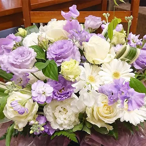 葬儀・通夜・法要などで故人を偲び、お悔やみの気持ちを込めて贈るお花です。白を基調に淡い紫や黄などをあしらい、上品で落ち着いた印象に仕上げます。 ご遺族や式場に直接お届けする供花や、命日・法要時のお供え花としてもご利用いただけます。