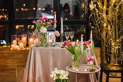 結婚式や披露宴の会場を彩るブライダルフラワーを承ります。式場やテーマカラーに合わせて、メインテーブルやゲストテーブル、ウェルカムスペース、バージンロード装花などをトータルにコーディネート。華やかで特別な空間を演出いたします。
